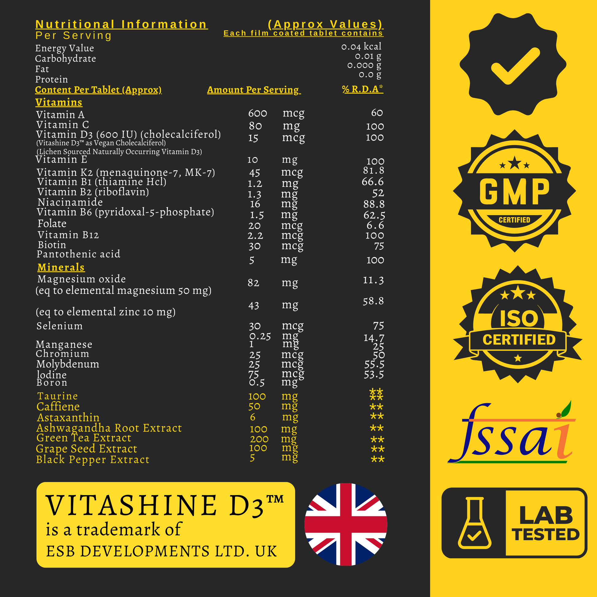 Multivitamin tablets for men (60 vegetarian tablets). Formula with 26 vitamins & minerals. Contains Ashwagandha root extract, Taurine, Green Tea extract, Grape Seed extract, Astaxanthin and Black Pepper extract. Includes Vitamin D3 (vegan source) and Vitamin K2 (MK-7).
